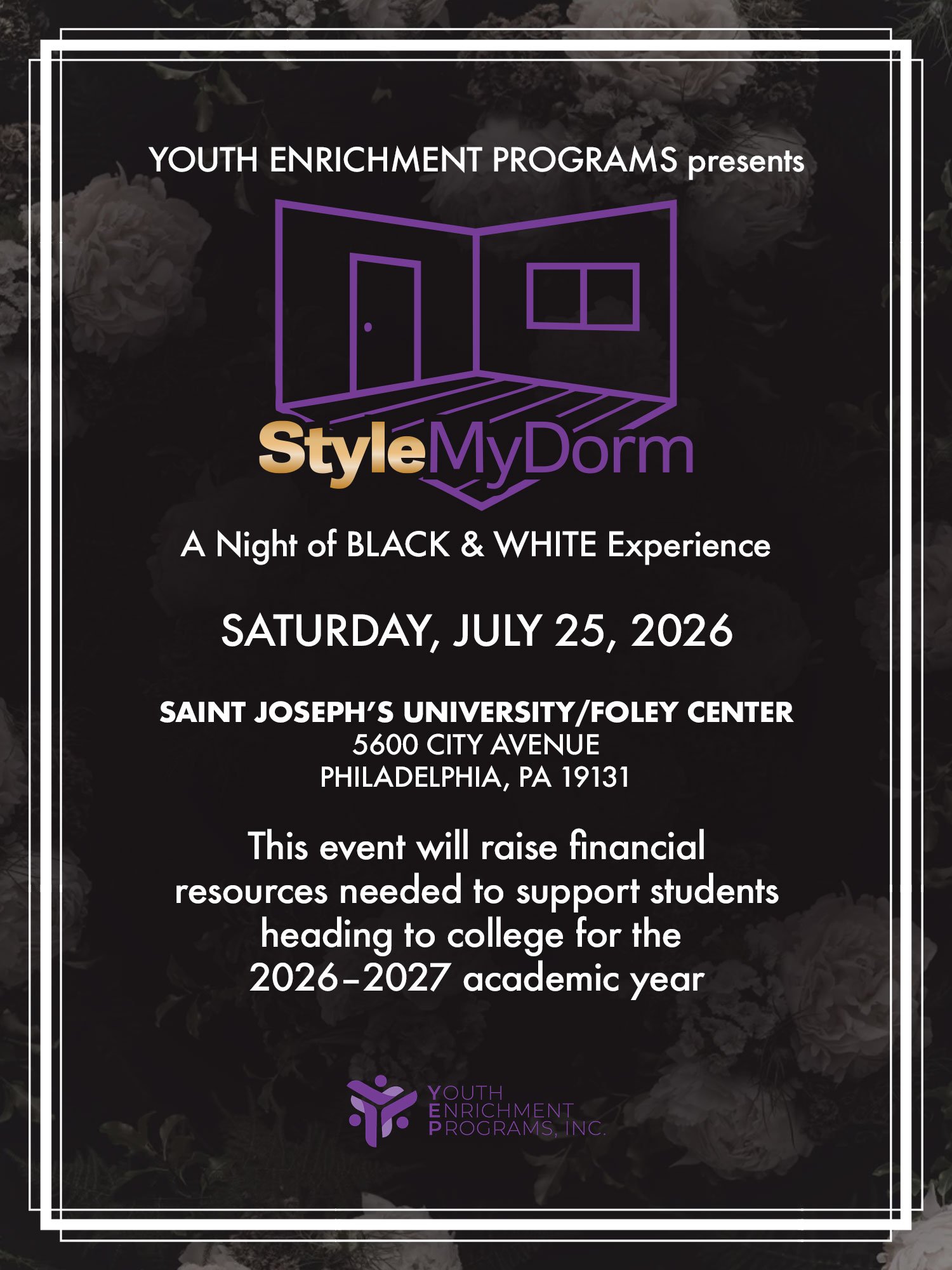 YEP invites you to an elegant evening at A Night in Black & White, our annual fundraising event. In 2026, celebrating our 4th year & we are excited to continue this mission with our “Youth Enrichment Programs Presents "Style My Dorm, A Night of Black & White Experience", scheduled for Saturday, July 25, 2026. This event will raise financial resources needed to support students heading to college for the 2026–2027 academic year—helping them settle into spaces that foster focus, creativity, and belonging. Proceeds will benefit STYLE MY DORM, a signature YEP initiative transforming student dorms into spaces of comfort, confidence, and community.